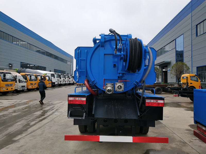 上裝配置 | 污水罐體容積:4方,水箱容積:2方。 吸污罐體材質:碳鋼, 板材厚度5mm。配大功率吸污泵,帶吸污管一根、罐體兩邊安裝液壓缸帶舉升功能,可以罐體舉升45度,后蓋液壓缸液壓打開,排泄更干凈,兩側安裝水箱,配備大功率高壓泵,流量:170L/min,10個高壓噴頭,60米高壓管。 |